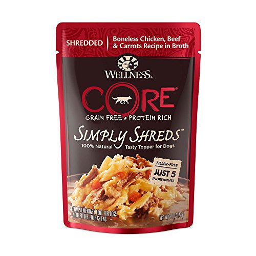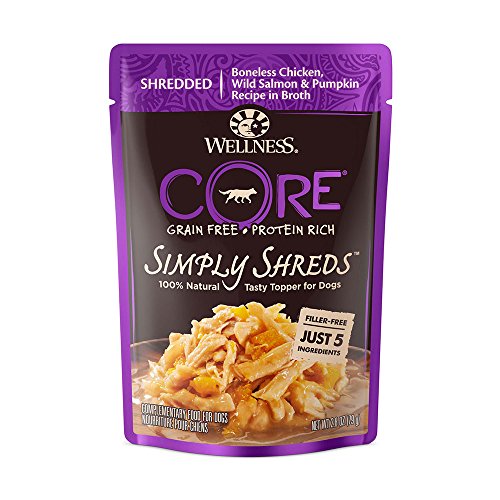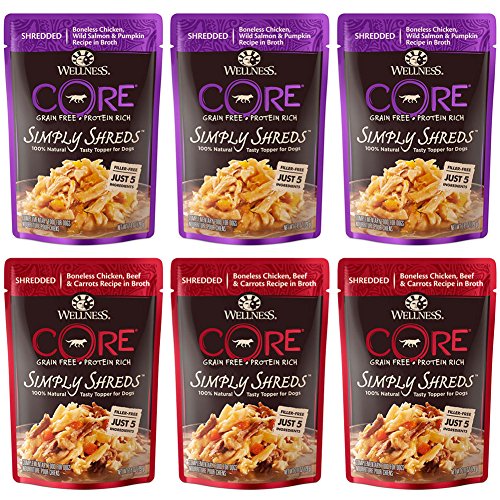 -. Title : Wellness CORE Simply Shreds Natural Grain Free Wet Dog Food Toppers Variety Pack - Boneless Chicken, Wild Salmon & Pumpkin Recipe and Boneless Chicken, Beef & Carrots Recipe (6 Pouches Total)