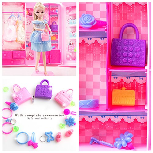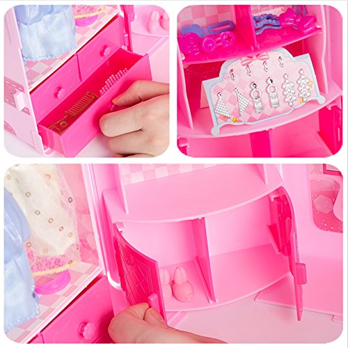 ENDLESS CREATIVE FUN WITH MANY ACCESSORIES: It includes working drawers, cabinets and hanger rack inside with dresses, shoes, purses, combs, jewelry, headdress and cosmetics, etc. Best gift for girls.