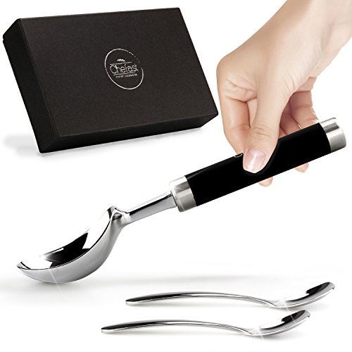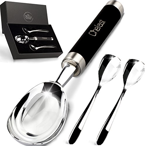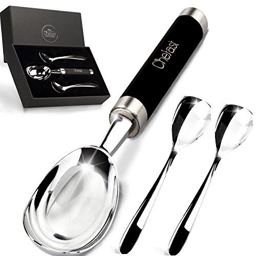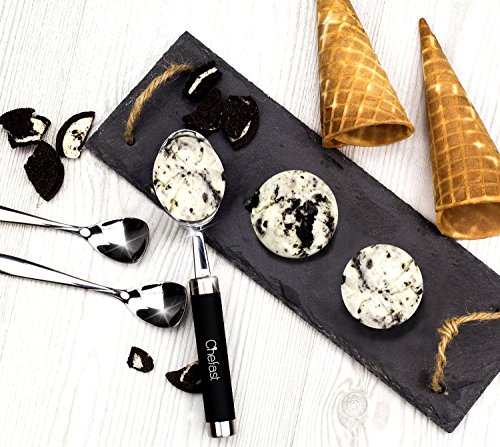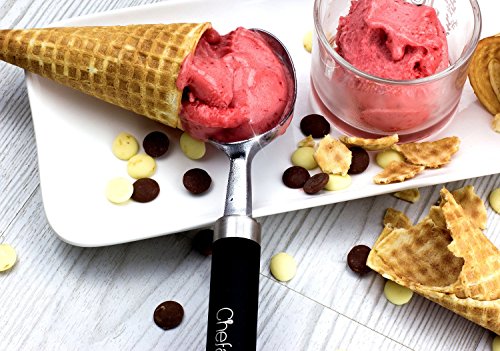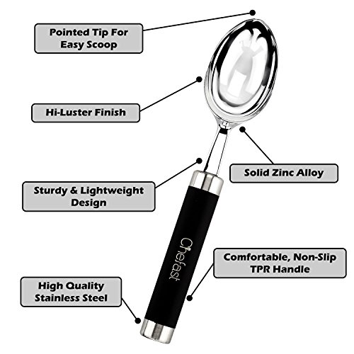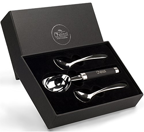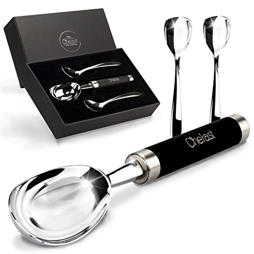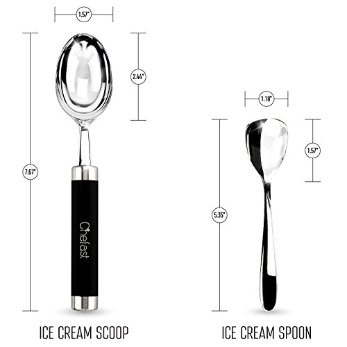 The Right Tool For The Right Job Are you sick of wrestling with hard ice cream right from the freezer every time you go to scoop it, to the point that you end up with bent spoons and a lot of frustration? Have you given up and resorted to letting the ice cream go soft before you scoop? Or, have you tried a plastic ice cream scoop only to discover that it's not worth the space it takes up in your drawer? If so, you have to try this premium ice cream scoop set by Chefast™. A zinc alloy scoop with a stainless steel handle and non-slip grip means effortless scooping and serving, for anything from ice cream to sorbet. Plus, it comes with two stainless steel spoons that won't bend on you no matter how hard the ice cream is. Throw It All In: We realize it's annoying when, after enjoying your ice cream, you're forced to hand-wash the scoop and spoons. That's why we made them dishwasher safe, so after your next yummy dessert, there's no need to wash anything separately. Give The Gift Of Easy Ice Cream: This is one of those gifts that will surprise the lucky recipient not only initially, but-due to its usefulness-over the long run as well. Plus, we took the time to package this set in a sleek, black gift box. From ice cream-loving friends to colleagues who would never think of such a thing, this combo stands out as a fun, practical present that will keep on giving. Gift grab, anyone? One-Year Warranty: Like with other Chefast™ products, we back our ice cream scoop combo with a full one-year warranty. If somehow something goes wrong, we're right here to give you a prompt replacement. Isn't Ice Cream Worth A Dedicated Scooper? We Think So, And Once You Try This, So Will You. Order Your Scoop Spoon Set Today, And Don't Forget To Grab Another As A Gift! 0