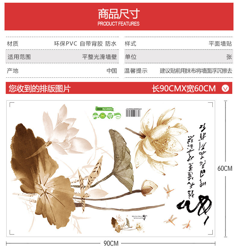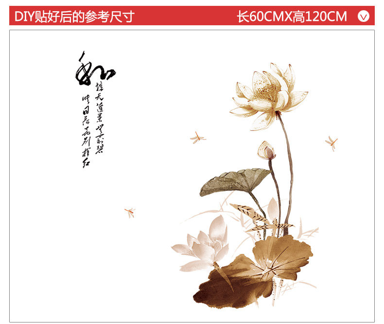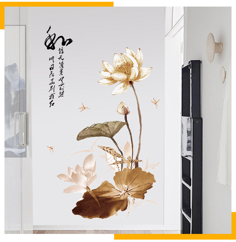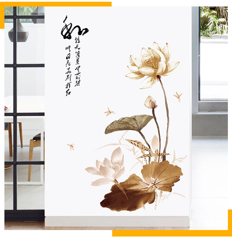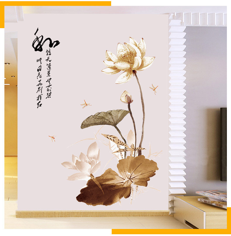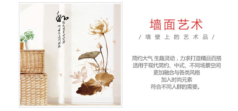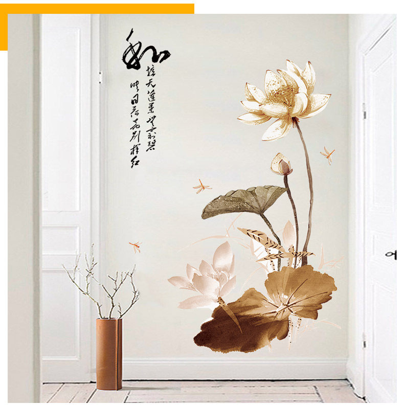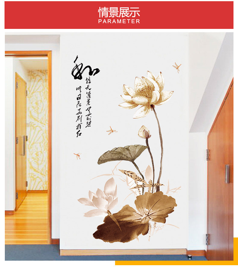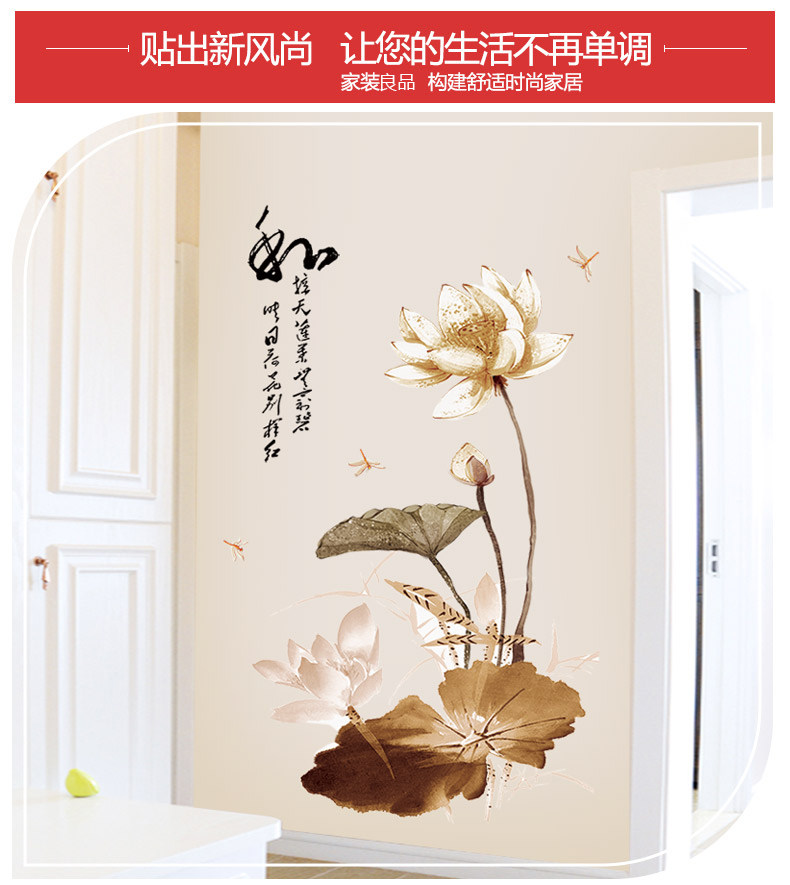 中式荷花墙贴中国风卧室客厅装饰墙壁自粘墙纸床头书房房间墙贴纸