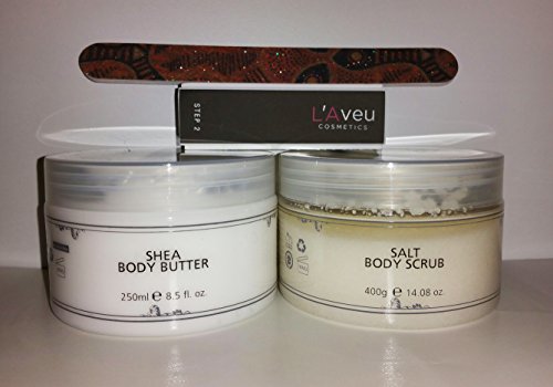 -. Binding : Misc. -. Brand : L'Aveu -. EAN : 0701980355493 -. Feature : Dead Sea salts and oils to revive and exfoliate dry skin / Leaving the body with an extraordinary soft feel / Shea Butter immediately replenishes the skin's hydration / Silky soft and radiant all day. / None of the products offered are tested on animals -. Label : L'aveu -. Manufacturer : L'aveu -. MPN : B01AW6ACT0 -. PackageQuantity : 1 -. PartNumber : B01AW6ACT0 -. ProductGroup : Beauty -. ProductTypeName : BEAUTY -. Publisher : L'aveu -. Studio : L'aveu -. Title : Set of L'aveu Salt Body Scrub 14.8 oz & Shea Body Butter 8.5 oz Plus GIFT Nail files set -. UPC : 701980355493