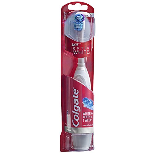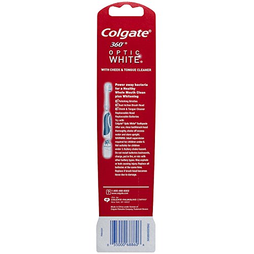 Colgate 360 Optic White Toothbrush is no ordinary toothbrush. Specially designed to whiten teeth, Colgate 360 Optic White Toothbrush has whitening cups and polishing bristles that power away bacteria for a healthy whole mouth clean. The soft rubber whitening cups are designed to hold toothpaste more effectively and remove surface stains while the polishing bristles help whiten teeth by polishing away surface stains and cleaning hard-to-reach places. Additional features include a unique cheek and tongue cleaner that comfortably removes odor-causing bacteria, textured soft gel handle that feels good while you brush, angled neck for better reach, and a wide thumb grip area for better control.Feature