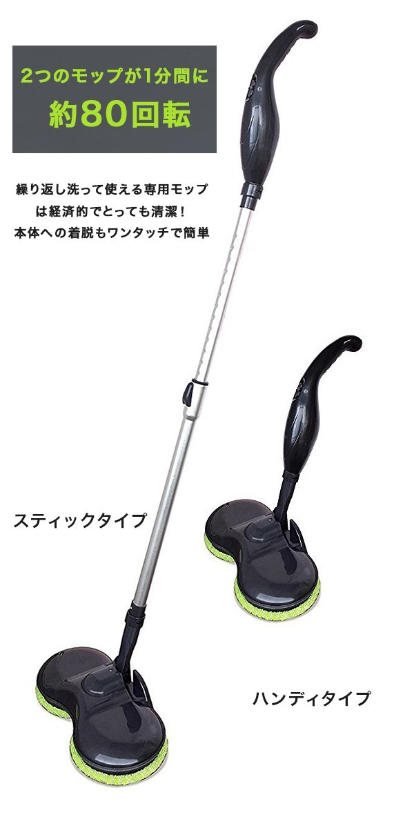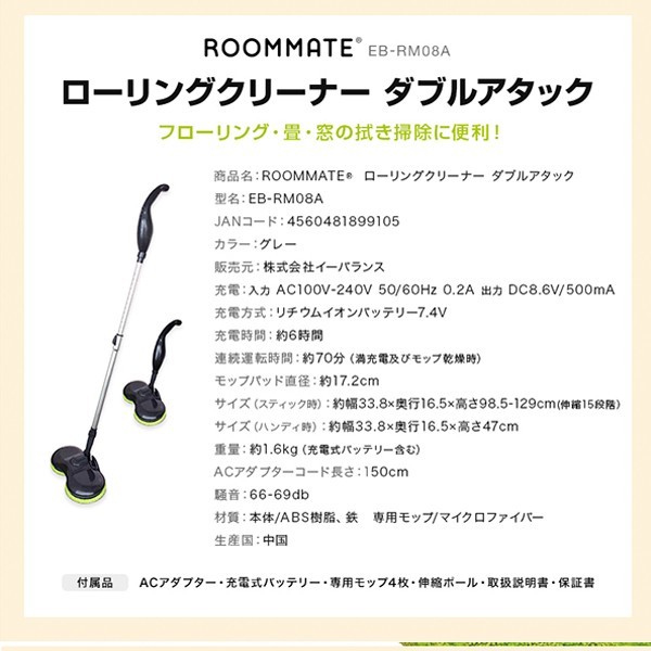 | 商品説明 | 「ROOMMATE(R) ローリングクリーナー ダブルアタック EB-RM08A」は、 充電式の回転電動モップです。 2つのモップが1分間に約80回転し、 床の汚れを専用モップでしっかりキャッチ。 専用モップは繰り返し洗って使えるのでとても経済的です。 スティック時は腰を屈めることなく、 立ったまま水拭き・拭き掃除が可能です。 フローリング・クッションフロア・畳などのお掃除に最適です。 使用しない時には本体にストッパーが搭載されており、 柄を直角に立てたまま収納することができます。 スティックは取り外しが可能。 ハンディタイプとしても使用いただけます。 ハンディ時は窓や壁などの水拭き・拭き掃除に便利です。 材質:本体/ABS樹脂、 鉄専用モップ/マイクロファイバー 付属品:ACアダプター、充電式バッテリー、専用モップ4枚、伸縮ポール、取扱説明書、保証書 原産国:中国 |