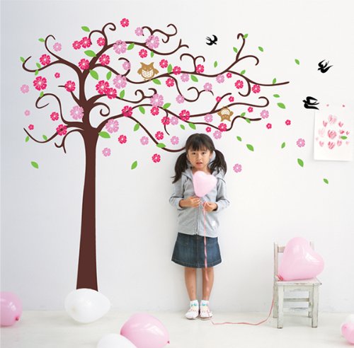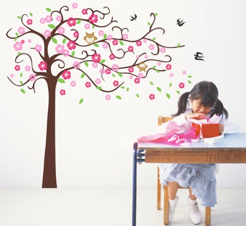 Pop Decors Removable Vinyl Art Wall Decals Mural for Nursery Room, Cute Flower Tree with Cute Owl