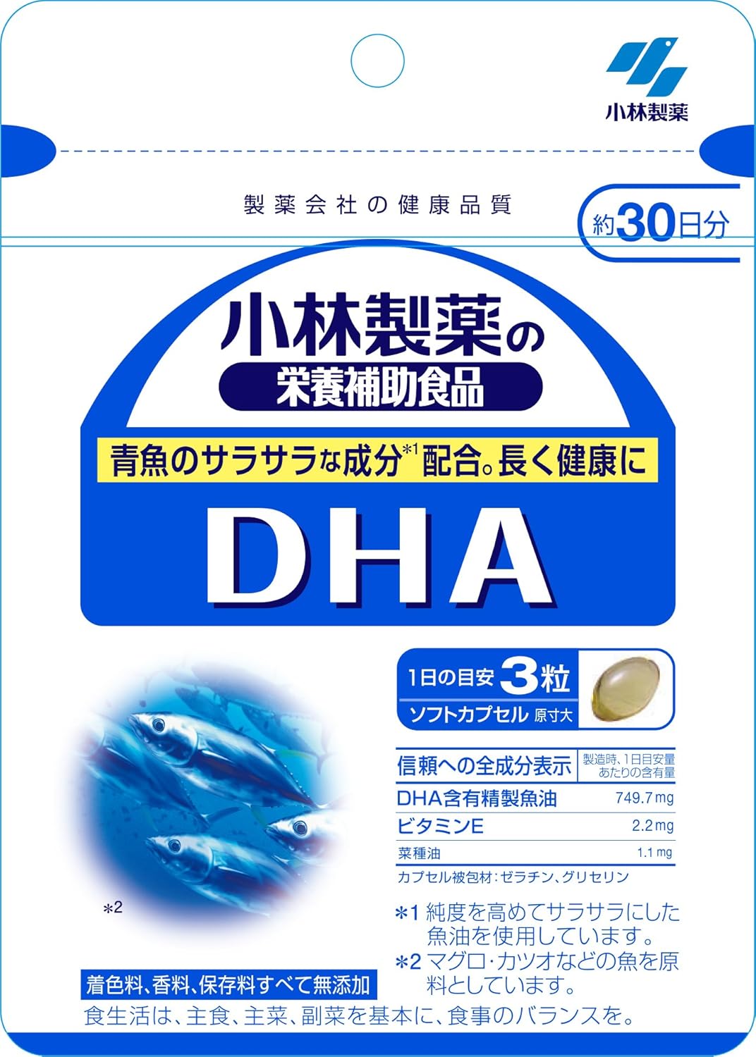 受験生や実年世代の方をサポート 原材料 : 1粒当たりの含有量:DHA含有精製魚油 249.9mg、ビタミンE 0.73mg、菜種油 0.38mg 栄養成分 : 1粒あたり:エネルギー2.9kcal、たんぱく質0.13g、脂質0.25g、糖質0.021g、食物繊維0g、ナトリウム0.011~0.11mg、ビタミンE 0.73mg、DHA 101mg(脂肪酸組成中46%)、EPA 11mg(脂肪酸組成中5%) 内容量 : 90粒 商品サイズ (幅X奥行X高さ) : 100×18×140