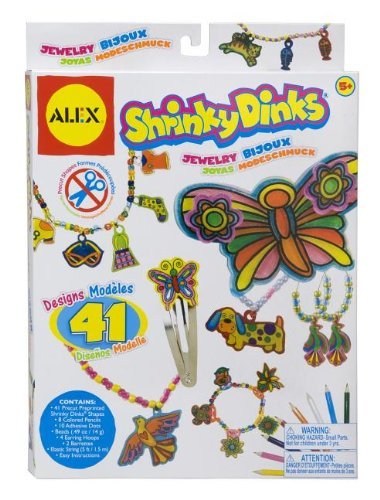 Shrinky Dinks Pony Jewelry is a fun way to spend a day indoors! Color, bake and shrink sox, fish, flowers and more. Make adorable charms, necklaces and earrings. Shrinky Dinks sheets are made of a special thin, flexible plastic which, when heated in an oven, shrink and harden without altering their color or shape. We precut all the fun shapes in every one of our kits to make them easy to work with! Includes 42 preprinted and precut Shrinky Dinks, 8 colored pencils, 10 adhesive dots, 0.49oz. of beads, 4 earring hoops, 2 barrettes, 5ft. of elastic string and easy instructions. Recommended for children 5 years of age and older.Feature