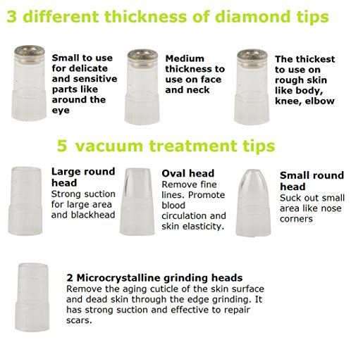 - REDUCE ENLARGED CLOGGED PORES. Diamond tip gently exfoliates and vacuum suctions out sebum, oil, blackheads and whiteheads from pores. Different speeds to adjust the suction strength. Works as a comedo suction.