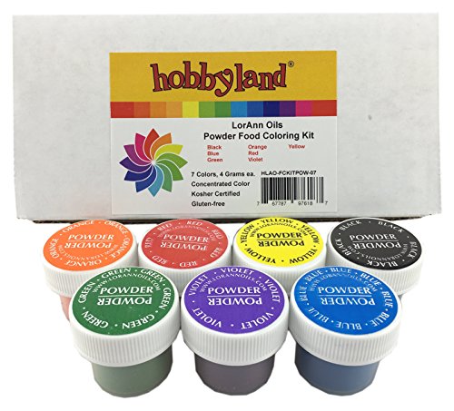 Studio : Hobbyland Publisher : Hobbyland Binding : Misc. Product Description Hobbyland carefully packs LorAnn Oils Powder Food Colors into kits. This kit has 7 Colors, 4 Gram Jars. LorAnn Oils Powder Food Colors are water soluble, gluten free and certified Kosher. Also, Made in the USA. This set includes Black, Blue, Green, Orange, Red, Violet and Yellow.