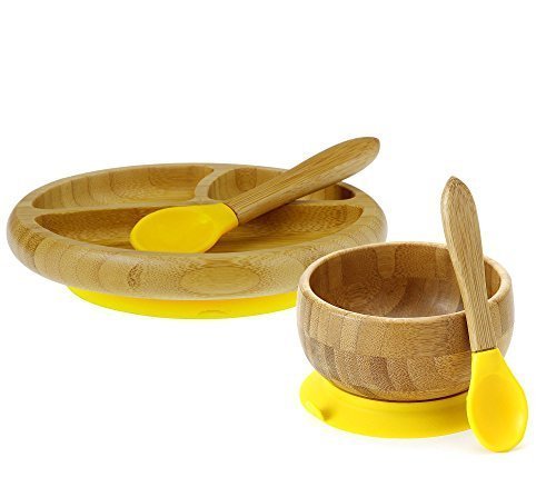-. Feature : BAMBOO BABY: Say goodbye to messy mealtimes with your little one! Foolproof functionality meets modern design with Avanchy's bamboo baby feeding products. These stylish supplies are crafted from real, biodegradable bamboo and feature bright, funky silicone accents for a fun pop of color. They are lightweight, can attach to any flat surface, and will last for years of use. / GREAT VALUE: Maven Gifts has paired the yellow Bamboo Stay Put Suction Bowl with the matching yellow Bamboo Stay Put Suction 3-Section Plate to help you save. Both the bowl and plate come with a silicone spoon. Avanchy's Stay Put Suction design features a removable rubber suction piece on the bottom of each dish for vacuum-sealed, spill-proof attachment. / EASY TO USE: To activate the Airtight Lock mechanism, firmly press your bowl/plate onto a flat surface until you hear all the air come out. Place the easy release tab facing the opposite side of your little one. To release, simply press the tab and the suction piece pops off just like magic! / COMPLETELY SAFE: Avanchy's products are always BPA, PVC, lead, and phthalate free, making them completely safe for babies and toddlers. To clean, hand wash with soapy, warm water and wipe dry. These products are not meant for microwaves, ovens, or dishwasher. / PRODUCT SPECIFICATIONS: Includes (1) Bamboo Stay Put Suction Bowl in yellow, (1) Bamboo Stay Put Suction 3-Section Plate in yellow, and (2) food-grade silicone spoons, each also in yellow. The bowl measures 4.5" in diameter and 2.75" high. The 3-section divided plate measures 6.5" in diameter and 1.5" high. Each spoon measures 5.5" long. For children ages 6 months and up.