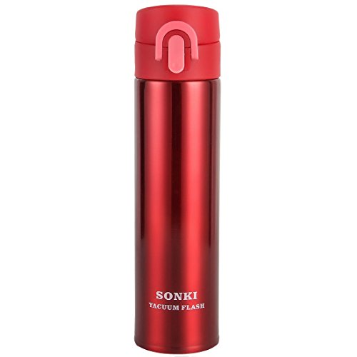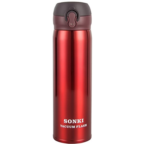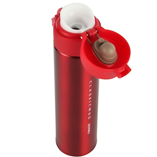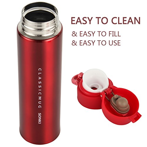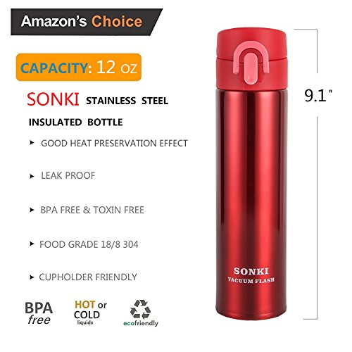 temperature.Sonki's 12 ounce Double Wall Vacuum Insulated Stainless Steel Travel Mug/Tumbler with Flip Open Lid is standard size and fits into most car beverage holders. The BPA-free one push lid lock system prevents spills, making the tumbler the best travel mug to use for commuting to work, going to school, camping, going to beach, and providing gifts.