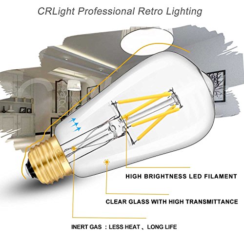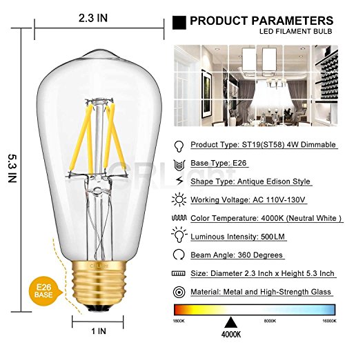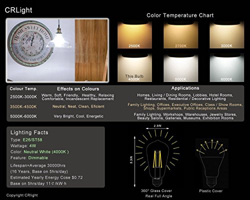 CRLight LED Edison Bulb 4W Dimmable 4000K Daylight (Neutral White) 500LM, 50W Equivalent E26 Medium Base, ST58 Vintage LED Filament Bulbs, 360 Degrees Beam Angle, Pack of 6