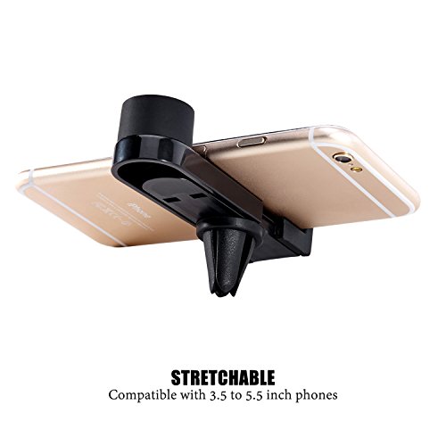 -. Feature : Suitable for 3.5 to 5.5 inch Phones; Compact size design, not only compatible with wide scope, but portable and easy carrying; its lightweight and small size fit easily into your pocket or bag, or you can easily take it on an airplane trip and use it in a rental car / Adjustable and rotatable in all directions for comfortable viewing angles;swivel 360 DEGREES for easy portrait and landscape mode,and its small and exquisite shape placed on the car will not affect the line of sight / Good Stability and firmness; the cross feet base of the mount can remain fixed into the air vent of your car regardless of road vibrations or impacts / Made of high quality and environmental protection ABS material to exacting standards that make it durable and long lasting / Multifunction: be used as car mount holder, phone holder or as a desk stand for your smartphone to watch YouTube movies; also can insert any card from your wallet into the rotating clip