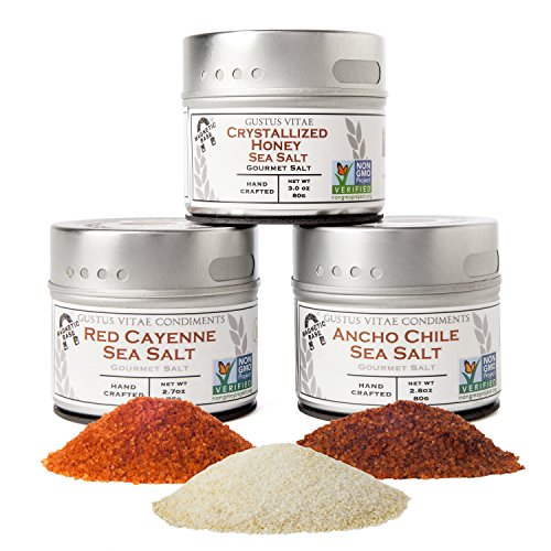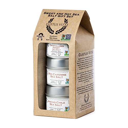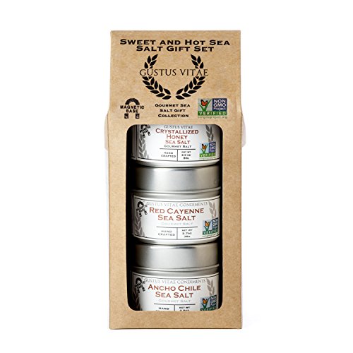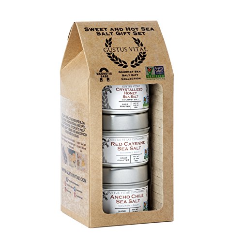 -. Binding : Misc. -. Brand : Gustus Vitae -. Color : Silver -. EAN : 0858407005551 -. Feature : Gourmet Sea Salt Gift Pack | Non GMO Certified / Small Batch | Hand Crafted / Unique Magnetic Tins Stick to Most Fridges, BBQ's, Ovens, Hoods, Metal Surfaces / No Artificial Flavors | No Artificial Colors | No MSG | No Fillers / Sustainably Sourced Ingredients | All Natural -. IsAdultProduct : 0 -. Label : Gustus Vitae -. Manufacturer : Gustus Vitae -. NumberOfItems : 3 -. PackageQuantity : 1 -. ProductGroup : Grocery -. ProductTypeName : GROCERY -. Publisher : Gustus Vitae -. Studio : Gustus Vitae -. Title : Sweet and Hot Sea Salts Gift Set - Non GMO - 3 Magnetic Tins - Small Batch Artisan Salts -. UPC : 858407005551