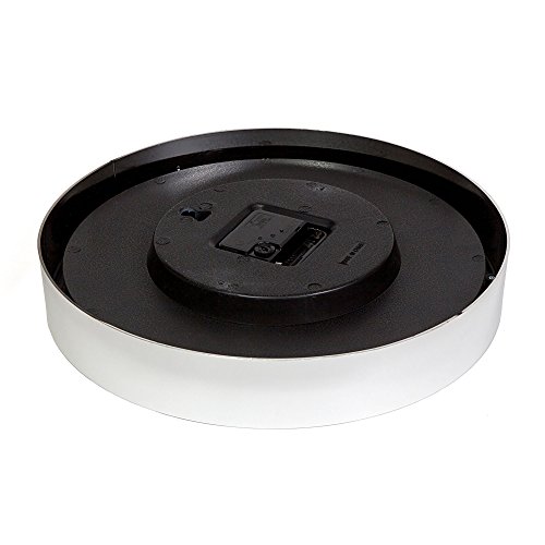 Style: Modern, contemporary Display: Analog Color: White face framed by silver chrome with black hands. Size: Extra-large 12 inches round in diameter. Material: Lightweight, durable plastic frame. Crystal glass face. Weight: Under 1 lb Search Terms: atomic television non 10 14 20 retro click hanging kids boys girls boys big floating oversized whisper indoors giant wallclock elegant precise precision smooth quartz movement xl l silent brushed nickel cool double giant stainless senior 0