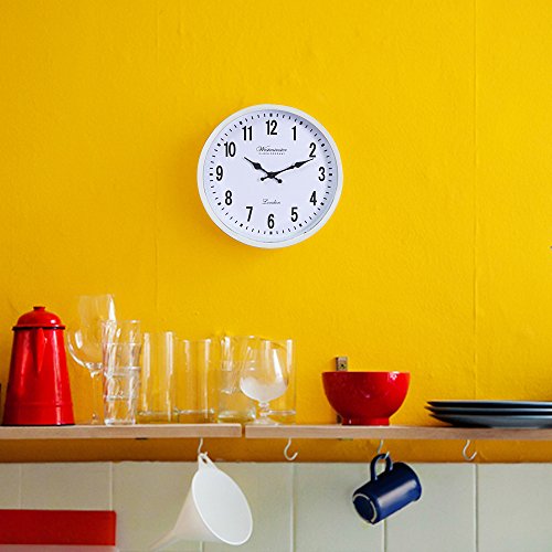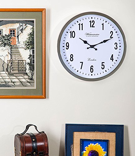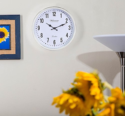 Westminster clocks are 12 inches in diameter and use contrasting colors for easy viewing. The large clock face is viewable from every corner of the room. Best for preventing eye strain, and for seniors or elderly with poor eyesight, and for kids learning to tell time. Excellent oversized clock for the office, kitchen, TV room, and bathroom. Also works well for the classroom, patio, garage, and gym. Don't settle for a plain white wall clock, when a beautifully thin round wall clock in chrome is both classy and functional for your family. Quick and easy to hang with just a nail, a hammer, and a little elbow grease. No mounting kit necessary.