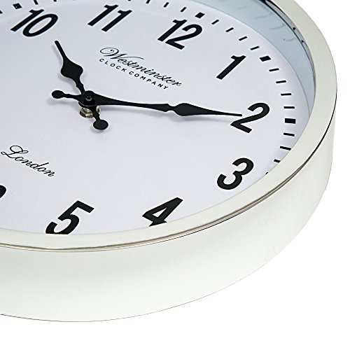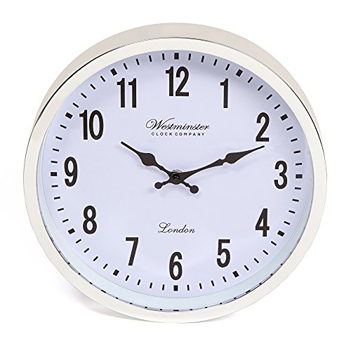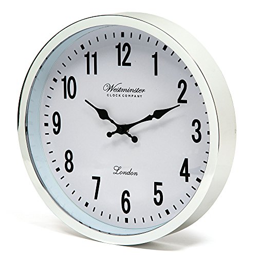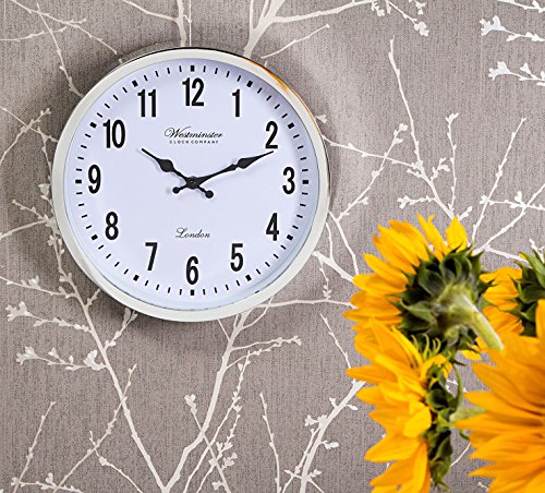 Westminster wall clocks are the perfect accessory for your home decorating. The extra-large wall clock fits every style of decoration from minimalist to contemporary. Designed to appeal to both men and women in any home decor. Framed in silver with a clear glass face, the modern chrome-finish plastic frame looks expensive, but is lightweight and functional. Similar in look to metal but isn't heavy and awkward. The decorative hands are beautifully shaped and give this clock extra style. Large arabic numerals and excellent time keeping.