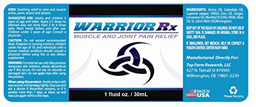 -. Feature : FAST MUSCLE & JOINT PAIN RELIEF. Create an optimal environment for your joints and muscles to start healing themselves. / DESIGNED BY MARTIAL ARTISTS, Warrior Rx was formulated with the hardcore athlete in mind. Revitalize your tired muscles & prevent soreness after exercising. / SPEED THE HEALING PROCESS and reduce swelling and bruising. Relieve and reduce pain from tendonitis, gout, tennis elbow, carpal-tunnel syndrome and relieve muscle cramps. / SAFE & EFFECTIVE. Relieve Joint & muscle pain WITHOUT ingesting something with potentially dangerous side effects. / MADE IN THE USA. Works on all types of joint pain, including back and hip... And much more!