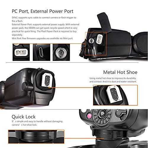 Powerful flash GN 60: The flash GN of PIXEL X800N PRO speedlite up to GN 60(ISO 100, focal length 200mm) A higher guide number means the flash is more powerful whick requires high technology and high quality materials