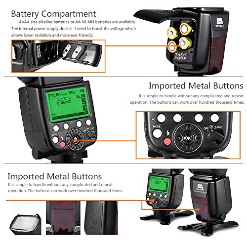 Compatible: Nikon D7100 D7000 D5300 D5200 D5100 D5000 D3300 D3200 D3100 D3000 D800 D750 D700 D610 D600 D300S D300 D200 D80S D80 D70S D70 D60 D50 D3S and all other Nikon DSLR Cameras. TTL full auto flash, supports HSS, 1st curtain sync, 2nd curtain sync and Red-eye reduction sync. It compatible with a variety of flash modes, such as i-TTL/M/RPT. It is compatible with all Nikon DSLR cameras. The stroboscopic flash duration is up to 500Hz