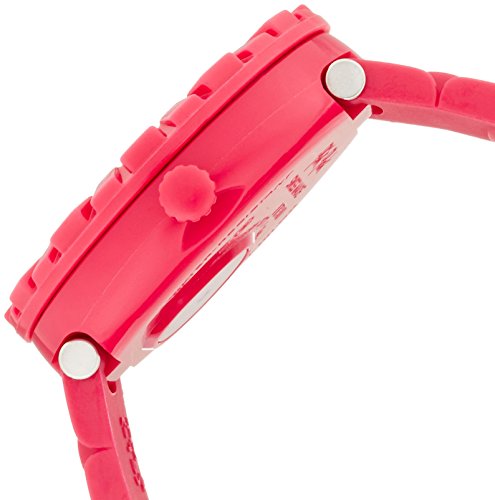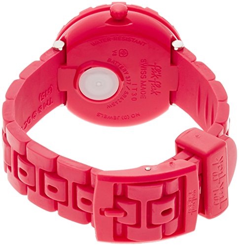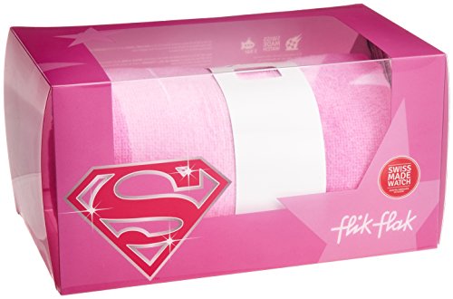 Pink plastic case with a pink plastic strap. Uni-directional rotating pink plastic bezel. White dial with luminous pink and red hands and Arabic numeral hour markers. Minute markers around an inner ring. Dial Type: Analog. Luminescent hands. Quartz movement. Scratch resistant plexiglass crystal. Pull / push crown. Solid case back. Case diameter: 35 mm. Case thickness: 9 mm. Round case shape. Band width: 16 mm. Tang clasp. Water resistant at 30 meters / 100 feet. Functions: hour, minute, second. Additional Info: comes with a matching beach towel. Casual watch style. Watch label: Swiss Made. Swatch Flik Flak Supergirl White Dial Pink Girls Watch ZFFLP003.