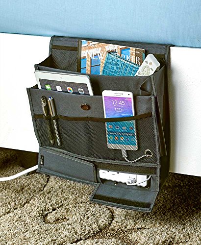 Studio : The Lakeside Collection Publisher : The Lakeside Collection Binding : Kitchen Product Description This Mindful Products Bedside Storage Caddy is the ultimate organizer. It contains 5 pockets that hold everything from your laptop and tablet to eyeglasses. Also has 2 pen holders. On the bottom, there's?a self-contained holder for your own 6-outlet power strip?with a fold-down flap that lets you plug in from the front. Rubberized grips fit under your mattress to keep the caddy in place. 14"W x 3/4"D x 14"H. Polyester. Imported. - Keep personal items nearby while relaxing in bed