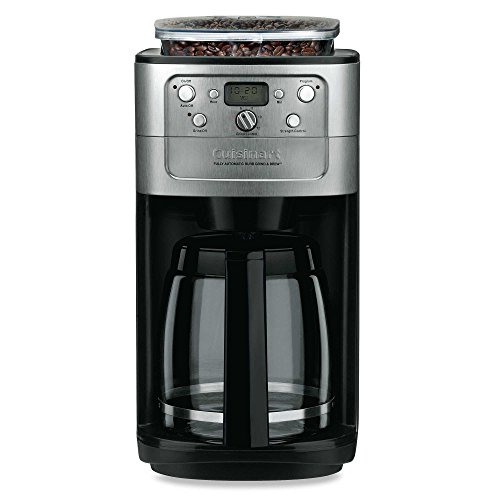 24-hour fully programmable coffeemaker with 12-cup capacity. Built-in burr grinder automatically grinds beans before brewing. Strength selector and grind control fine-tune intensity and volume. 8-ounce bean hopper; auto shutoff; water filter; brew-pause function. Measures 10-2/3 by 8-4/9 by 16-1/4 inches.