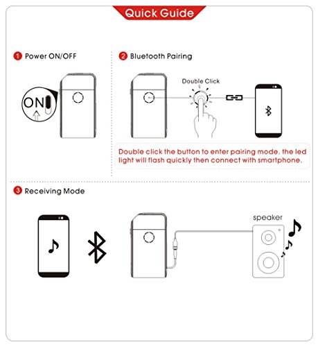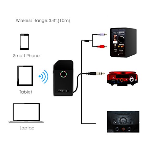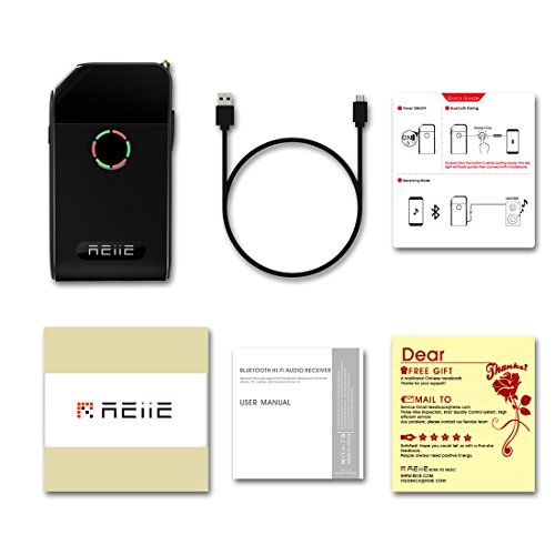 -. Feature : - Bluetooth 4.0-enable all 3.5mm media devices (enable Bluetooth receiving: speakers, headphones and more). / - Simple one-button,Easy to Use. / - Ideal For Any Powered Speakers Or Devices Using Standard RCA Or 3.5mm Jack Or AD2P.Bulid in rechargeable lithium lon battery and Batter capacity display. / - Supported Bluetooth,Profiles: A2DP; operation range: 33 ft / 10m.battery life: about 15 hours. Can use while charging. / - Package Contents: REIIE Bluetooth Receiver,USB to Micro USB Cable,User manual ,Quick Quide,Warranty Card.Warranty policy: 12 months free reliable warranty.
