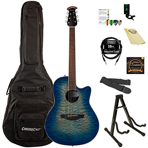 Studio : Ovation Guitars Publisher : Ovation Guitars Binding : Electronics Product Description The Celebrity Standard Plus series is your first step into the world of Ovation, with select figured tops, beautiful abalone appointments and first-rate sound, features and value. The Celebrity Standard CS28P-RG guitar has the classic Super Shallow bowl Lyrachord cutaway body with a striking Figured Koa top featuring quarter sawn scalloped “X” bracing. We reviewed earlier Ovation bracing patterns extensively to arrive at this remarkable new design, which borrows from the past and is voiced for the present with natural tone and optimal response and power. Together, the body and top create the classic Ovation sound, resonating with full projection, remarkable note clarity and balance, and nuanced tonal complexity. The Quilted Maple top also has an elegant abalone rosette, ivory white binding and beautiful Natural gloss finish. Other premium features include an effortlessly playable neck with a natural satin finish and rosewood-veneer headstock, 20-fret bound rosewood fretboard with abalone microdot inlays, and a rosewood bridge. For great live sound, the CS28P-RG features an Ovation Slimline pickup and OP-4BT preamp system with three-band EQ, volume/gain control, onboard tuner and low-battery light. 0