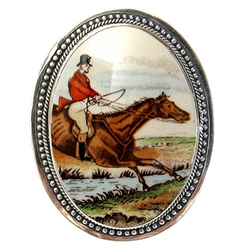 -. Title : Broken China Jewelry Copeland Spode The Hunt Brown Horse and Rider Large Sterling Pin Brooch