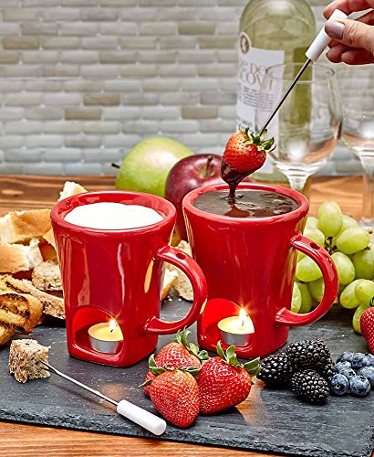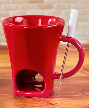 Studio : RaDEPOT Publisher : RaDEPOT Product Description Enjoy fondue-for-one with this Fondue Mug Gift Set that includes a bright red mug and a fondue fork. It's easy to use--simply melt the chocolate or cheese and keep it warm by slipping your own lit tea light into the base of the mug. Dip fruit, cake, bread and more with the fork, which rests in the mug's handle for easy storage when not in use. Mug, 5 oz. Fork, 5-3/4"L. Stoneware. Microwave and dishwasher safe. Personal size makes it easy for one person to enjoy fondue Fork stores in handle 2 Sets shown Details: Mug, 5 oz. Fork, 5-3/4"L Stoneware Microwave and dishwasher safe 0