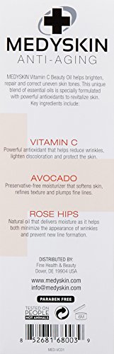 Medyskin Vitamin C Beauty Oil helps brighten, repair, and correct uneven skin tones. This unique blend of essential oils is specially formulated with powerful antioxidants to revitalize skin. Repairs and rejuvenates skin. Protects skin from environmental factors and sun damage. Deeply hydrating preventing the formation of fine lines.