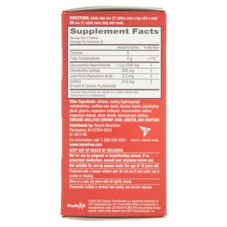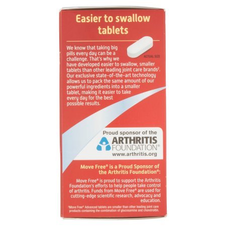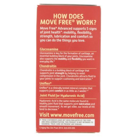 Studio : _MOVE FREE Publisher : _MOVE FREE Binding : Health and Beauty Product Description Our Move Free Triple Strength formula contains premium-quality ingredients to comfort your joints with just two tablets per day: Uniflex: A clinically tested mineral complex found naturally in fruits and vegetables that is patented to deliver protection and comfort of joints.*(1) Joint Fluid: Helps to lubricate, rejuvenate, re-hydrate and repair joints.* Clinical studies show that oral hyaluronic acid is absorbed into joints. (Balogh, L., et al., J Ag Food Chem 2008). Glucosamine: Helps by strengthening, protecting and rebuilding joints.* Chondroitin: Assists in lubricating and cushioning joints.We're dedicated to finding the most effective ways to help people move better and feel better. Move Free's formula takes glucosamine/chondroitin to the next level by adding Uniflex hyaluronic acid. So, it actually helps improve your joint health.* We're also dedicated to making our tablets easy to swallow, which is why Move Free has smaller tablets than other leading joint care brands.(3). Our exclusive state-of-the-art technology allows us to pack the same amounts of our powerful ingredients into a smaller, easy-to-swallow tablet. Sure Dissolve. Schiff Sure Dissolve tablets are formulated to disintegrate within one hour. Guaranteed: No added sugar (sucrose, fructose, lactose), salt (sodium chloride), yeast, wheat, gluten or milk. No preservatives or artificial flavors. Move Free Triple Strength Glucosamine Chondroitin joint supplements contain premium-quality ingredients, including glucosamine, chondroitin, uniflex, and hyaluronic acid, to promote the health of your joints. Move Free Triple Strength promotes joint flexibility, comfort and lubrication. 0