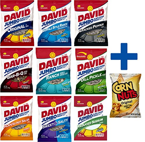 - David Jumbo Sunflower Seeds Variety Pack includes: Jumbo Original,Jumbo Cracked Pepper, Jumbo Bar-B-Q, Jumbo Jalapeño Hot Salsa, Jumbo Ranch, Jumbo Buffalo Style Ranch, Jumbo Sweet & Salty, Jumbo Reduced Sodium and Jumbo Dill Pickle