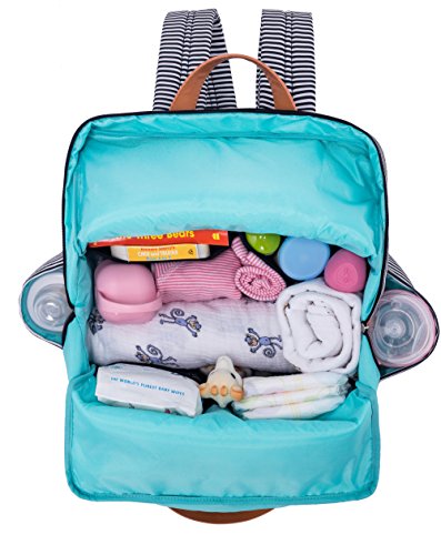 PLENTY OF SPACE – A total of 12 pockets; 2 large and 10 small. Everything has its place. The pockets include 1 large main compartment with a secured zip closure; 2 foam-insulated side pockets; 1 specially designed front mommy pocket with 2 small different edge pockets; 1 quick-access top pocket; 4 internal organizing pockets and 1 large back compartment for a changing pad or laptop.