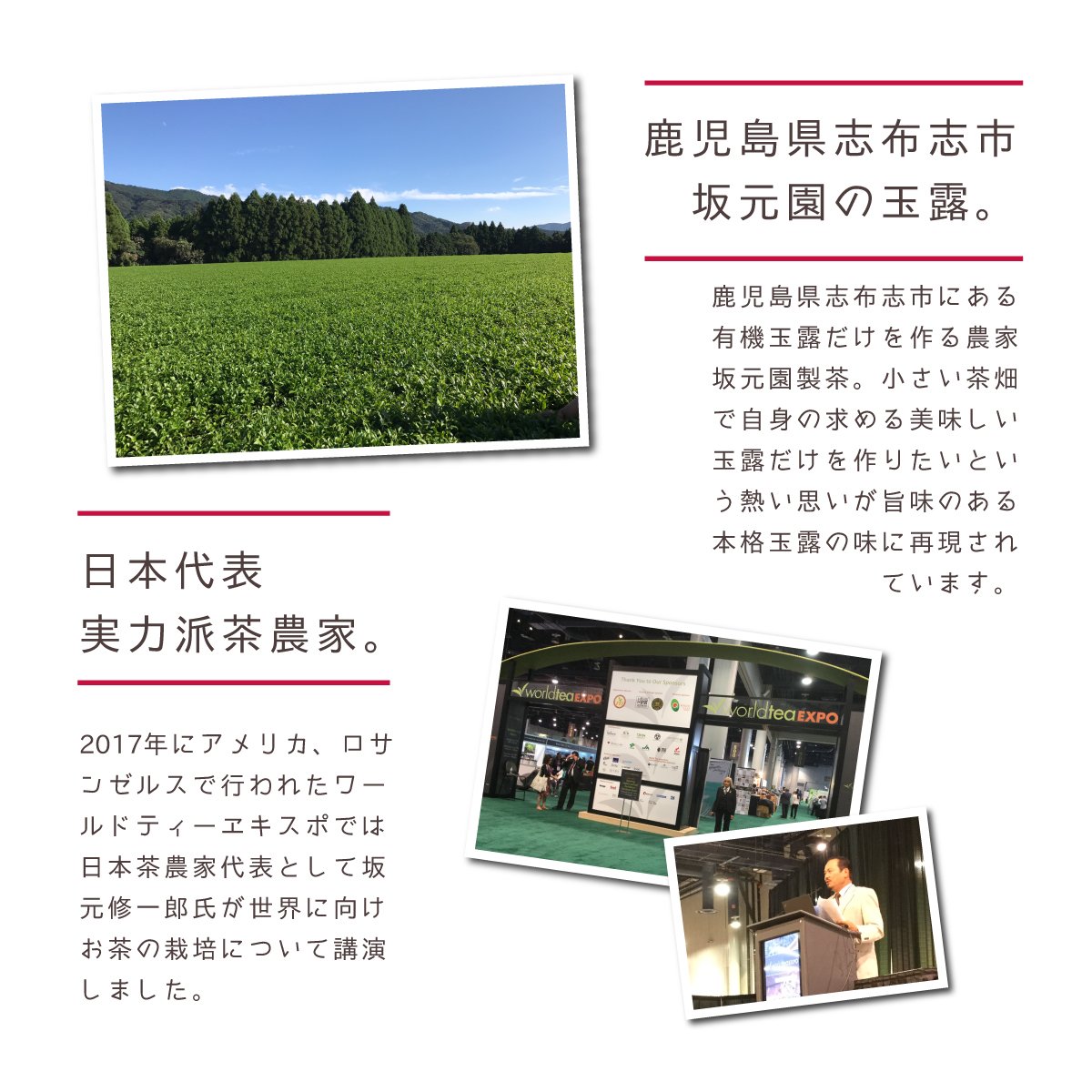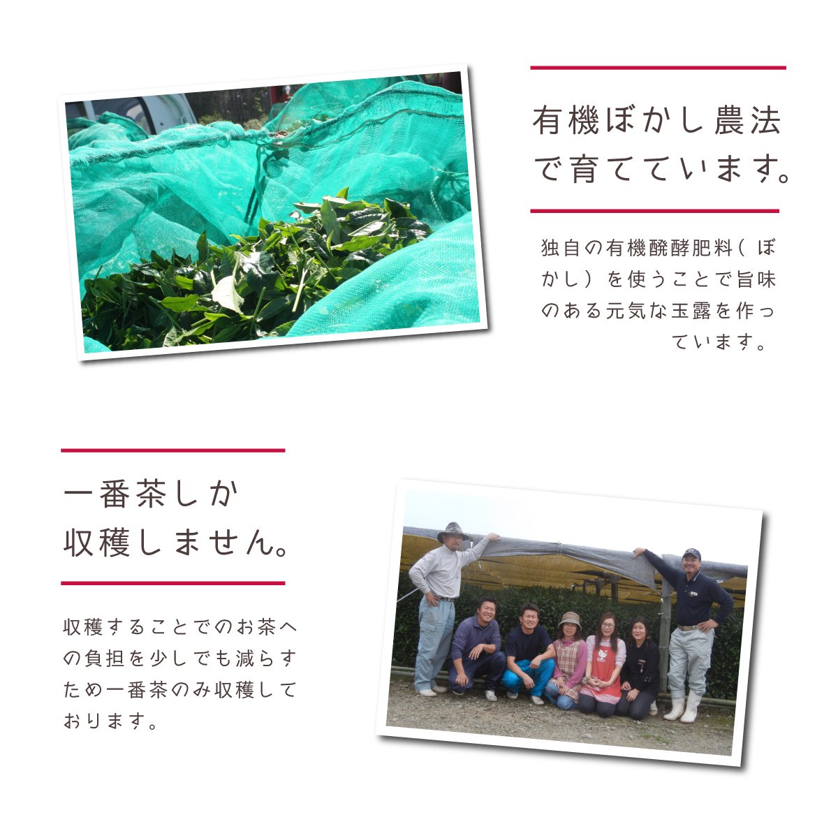 | お勧めの飲み方 | 1煎目、沸かした水を冷まして40℃のお湯で2分抽出。2煎目、50℃。煎目、60℃。 |