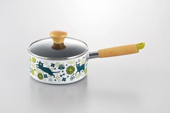 花柄と猫のデザインが目を引くIH対応のアルミ片手鍋15cmです。内面フッ素樹脂加工なのでお手入れしやすく、取っ手は天然木を使用しているので手になじみます。 |