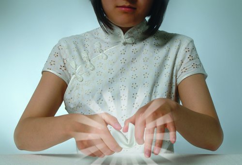 Two carefully hand-folded porcelain fortune cookie on a bed of natural wood shavings