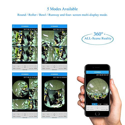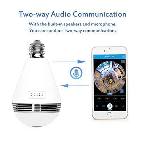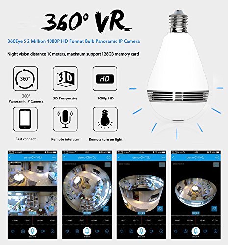 -. Feature : WIDE VIEW ANGLE: 360-Dgree wide view angle, no blind area with 960P high resolution, applicable to different monitoring scenarios, supporting 5 different viewing modes and loop recording in the micro SD card(up to 128GB). / MOTION DETECTION: When any motion is detected, security system will send alert message to your mobile via app, offering more security for your place. / REMOTE CONTROL: Dimmable brightness control from anywhere with your phone, using the free app 360Eyes (work with iOS/Android), easy to install. / TWO WAY AUDIO: Communicate with families, friends and your pets freely by wireless camera bulb, through particularly clear audio. / LIFETIME WARRANTY - Your Satisfaction matters to us, If you are not satisfied with Bulb Panoramic Camera, please feel free to contact us. We provide Lifetime Warranty and Unconditional 30-Day Refund & Free Lifetime Technical Support.