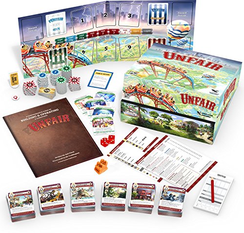 Buld. Bribe. Blackmail. All the fun of the fair! building an amusement park has some ups and downs, especially when there’s competition in town. In unfair, players will realize their dreams of opening their own theme park, but often, dreams turn to nightmares. Over the course of eight rounds, players will draft cards to construct rides and attractions based on multiple themes, decking them out with upgrades. Staff members will help attract customers, and if all else fails, you can go looking for spare change. It’s a tough business though, and before long, city inspectors, vandalism, and lawsuits might make them realize that life is unfair!Feature