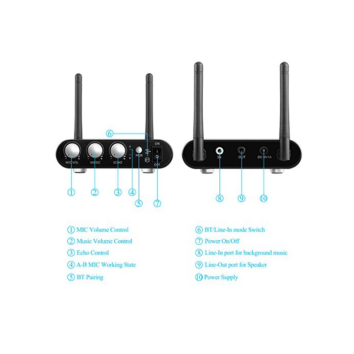 BGM의 스피커 출력은,Bluetooth모드와 라인 모드를 선택할 수 있습니다.마이크의 음량 조정과 echo 조정,스피커의 음량 조정은 각각 개별로 조정 가능합니다.