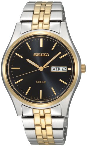 -. Binding : Watch -. Brand : Seiko Watches -. Color : Silver -. Department : mens -. EAN : 0029665153470 -. Feature : Solar; Quartz movement keeps accurate time, no battery required / Powered by all types of light / Solar cell with high performance electricity generation / Energy-efficient movement with long power reserve / Water resistant to 99 feet (30 M): withstands rain and splashes of water, but not showering or submersion -. Label : Seiko -. Manufacturer : Seiko -. Model : SNE034 -. MPN : SNE034 -. PackageQuantity : 1 -. PartNumber : SNE034 -. ProductGroup : Watch -. ProductTypeName : WATCH -. Publisher : Seiko -. Studio : Seiko -. Title : Seiko Men's SNE034 Two-Tone Solar Bluish black Dial Watch -. UPC : 704181344563