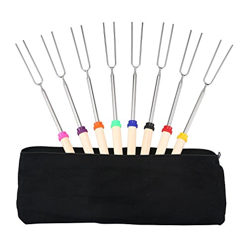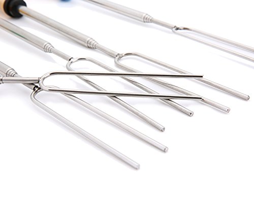Features: The sticks have rubber protective removable tips on them. The handle rotates so you can easily turn what ever you are cooking. 10" skewers fits into a small fabric pouch but then the telescoping wand extends to 32". These are perfect for campfire cooking, fire pit, picnic, barbecue grill.