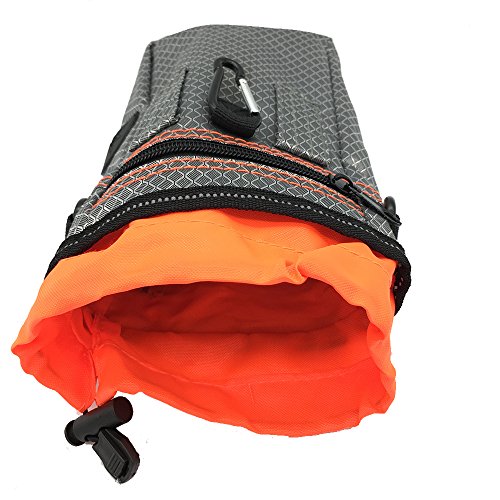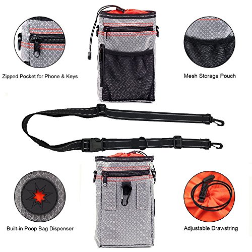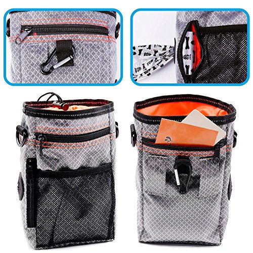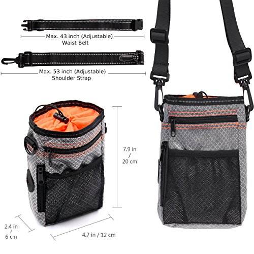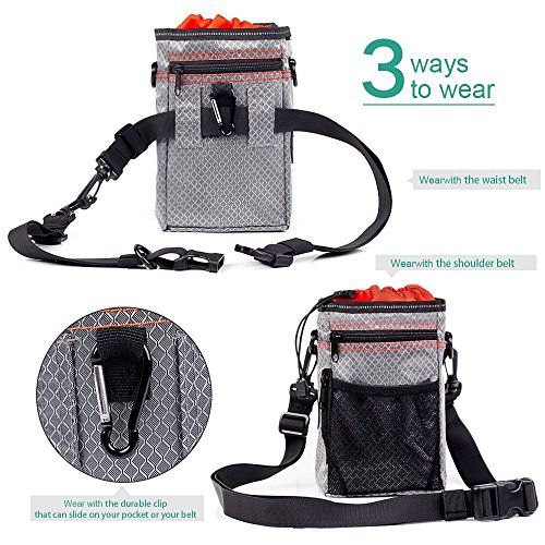 Features: Large Space holds approx 2 cups dog food, toys. Zippered pouch fits iPhone 6/6s/7, cash, keys and ID cards. High-quality fabric that withstands harsh weather conditions. 3 ways to wear Integrated bag dispenser: easily pull out waste bags. Drawstring closure keeps treats dry and not spilling out. Zipper pockets hold your valuables securely. The inner pouch can be pulled out for easy cleaning and emptying. Easy to use and clean. water-proof.