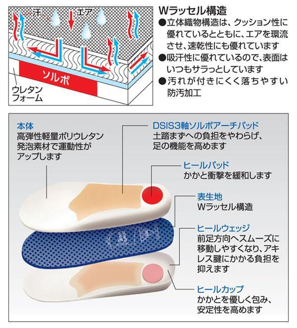 DSISソルボウォーキングは、シューズの中のインソールを取り替えるだけで、フィット感と安定性が高まります。またクッション性と速乾性に優れたWラッセル構造なので快適な履き心地です。