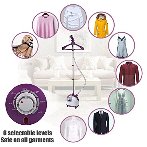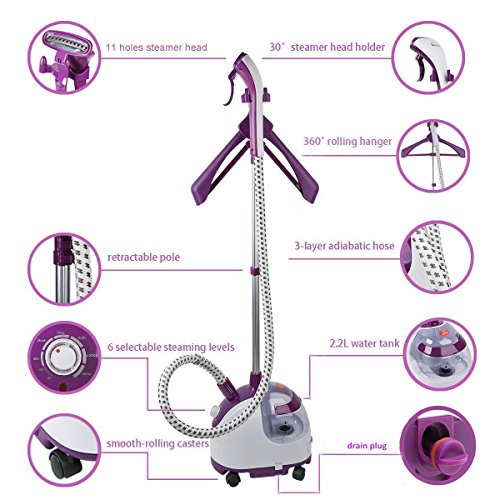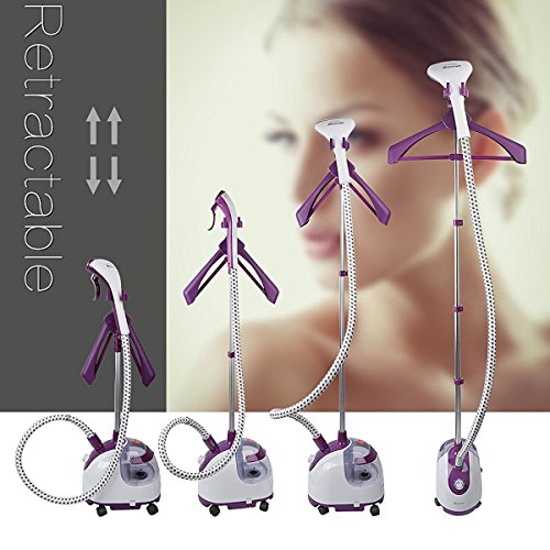 -. Feature : Unser Dampfglätter besteht aus folgenden Komponenten: dem Dampfkopf, der mit mit der Nanotechnologie arbeitet, einem Verbindungsstecker aus Edelstahl, einer 3-schichtigen, adiabatischen Luftkammer und dem Material Polypropylen. Die meisten Dampfglätter weisen, im direkten Vergleich, eine geringere Qualität auf. Unser Dampfglätter ist strapazierfähig, kommt ohne Konservierungsmittel aus und ist von langer Lebensdauer. Die Garantiezeit beträgt ein Jahr, wenn sie den Dampfglätter bei uns kaufen. / Unser Dampfglätter ist mit einem sichtbaren, 2.2L Wassertank ausgestattet. Diese vertikale Kleidungsstück Dampfer mit 2.2L sichtbaren Wassertank ausgelegt. Anhand des Tank können sie den geringen Wasserverbrauch beobachten. Sie werden den Tank bei der Größe nicht ständig neu mit Wasser befüllen müssen. Der Dampfglätter dampft kontinuierlich für etwa 70 Minuten. Sie können Seide, Wolle, Baumwolle, Fasern, Leinen und andere Textilien glätten und ihnen einen frisch gebügelten Eindruck verschaffen. / Der Dampfglätter verfügt über einen Fußschalter, 6 wählbaren Dampfstufen und dem Dampfkopf mit 11 Löchern. Die Dampfbürste ist dank des ergonomischen und kompakten Designs leicht und komfortabel in der Verwendung. Der Dampfglätter ermöglicht es Ihnen Ihre Vorlieben ganz umzusetzen. Er besitzt zudem eine schnelle Aufheizfunktion, sondert Dampf in 45 Sekunden ab, Der Wassertank ermöglicht es Ihnen Wasser zu jeder Zeit nachzufüllen. / Da sich der Kleiderbügel um 360° drehen lässt, können Sie Ihre Kleidung in allen möglichen Positionen glätten. Bürste und Clips für Hosen sind bei dem Dampfglätter beigefügt. Kombiniert mit der glatten Walzen Rollen und versenkbare polig für leichte Manövrierbarkeit bereitzustellen, ist dies sogar noch einfacher als die chemischen Reinigungen zu besuchen. / Der Dampfglätter kann auf eine Entfernung von bis zu 1.5 Metern glätten. Der Dampf kann bis zu 102℃ erfolgen. So haben Sie die Möglichkeit Gerüche, Bakterien, Viren, Staub und Milben aus Ihrer Kleidung zu entfernen. Mit dem patentierten Verbindungsstecker können sie den Dampfglätter schnell lösen. Sollten Sie Probleme bei der Funktion des Dampfglätters haben, kontaktieren Sie uns bitte. Wir werden Ihnen Lösungsvorschläge anbieten.