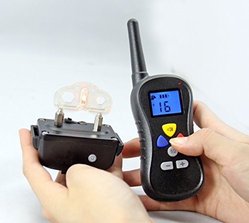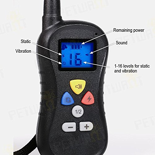 Studio : DIRECTTRADE INC. Publisher : DIRECTTRADE INC. Binding : Misc. Product Description Separate Buttons for Collar Tone, Vibration and Shock Corrections. Vibration and Shock have 16 Different Correction Levels. No more scrolling through menus to get to the right correction.The remote control dog training collar is used to training dogs obey owner's commands, correct dog's bad habits, and stop dog from barking. It ranges up to 800m, can expand to 2 dogs. 8 levels of vibration and safe stimulation. Easy and effective intensity levels of Stimulation/Vibration in accordance with different responses from dogs. User-friendly big LCD display. Blue back light LCD display to ensure usage under low visibility. Waterproof design allows to wear this collar swim. Battery indicator to check power supply anytime. 500m remote control range. Audible tone gently customized according to dog hearing system. One remote control with two collar receivers(extra one optional), thoughtful for pet owners. Training two dogs individually or simultaneously under same chosen mode. System include: 1 X Receiver Collar 1 X Remote Transmitter 1 X Test Light Tool 1 X Black TPU Strap Collar (collar length adjustable from 25cm to 65cm) 1 X plug adaptor (different standard plug available) 4 X Metal Contact Prongs (2 short and 2 long) 1 X Wrist Strap 1 X Training Guide 1x USB cable 1X splitter cable 0