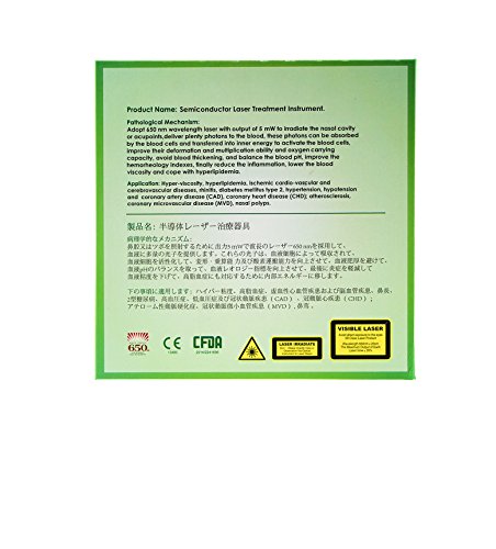 Studio : Guangdun Publisher : Guangdun Binding : Health and Beauty Product Description nasal diode low level laser therapy for rhinitis Application Range Hyperviscosity,hyperlipidemia, hypertension, ischemic, cardiovascular and cerebrovascular diseases. It also has good curative effect on the rhinitis, allergic rhinitis, acute rhinitis, sinusitis and nasal polyps. Advantages: 1. Small size and portable, can be used at anytime and anywhere. 2. Dual output capability so as to be used simultaneously by two people. 3. Large LCD screen display the time, date and calendar. 4. High-class and durable metal enclosure which is conducive to heat diffusion for the power stable. 5. Specially added laser stabilizer. 6. High-capacity lithum battery. 7. HIgh quality import laser head with long life span. 8. Two output modes: Pulse and Continues, can be switched manually or automatically. 9. Adjustable treatment time/power. 1. What's the treatment course? As a general patents, Twice per day .15 minutes for each time, 7-10 days for one treatment session. After 7- 10 days,Stop one or two days, Then, continue for next session.No any side effects under the long-term use. During the treatment, drink more, eat more vegetables . 2. Why Irradiation Nasal cavity? The location of nasal cavity is close to brain which is the center of human bosy.Abudant vessels and nerve systems are distributed under the nasal cavity.60% blood flow of nasal mucosa goes through arteries and vein, and blood goes through nasal cavity at around 3 minutes. 0