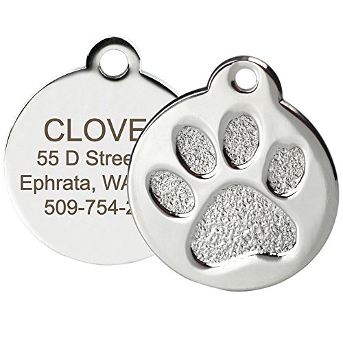 [Product Information]- Stylish and durable, this stainless steel pet ID tag features an embossed paw print in a polished mirror finish surface