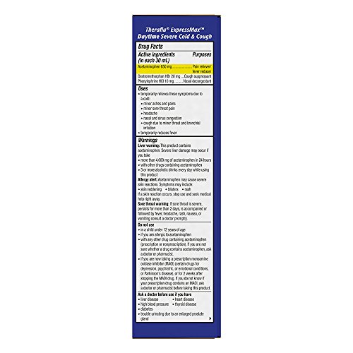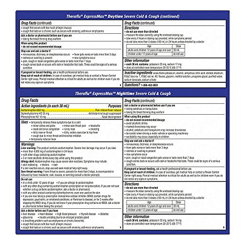 ReleaseDate : 2015-07-01 Studio : Novartis Consumer Healthcare Publisher : Novartis Consumer Healthcare Binding : Health and Beauty Product Description Theraflu ExpressMax Combo Daytime and Nighttime Syrup for Severe Cold and Cough gives you serious, warming relief. Its berry flavored syrup combines maximum strength* medicines available without a prescription. Get relief from nasal congestion, cough, body aches, sore throat, sneezing**, runny nose**, sinus congestion, headache, and fever. *Maximum-strength per 4-hour dose **Nighttime Only 0