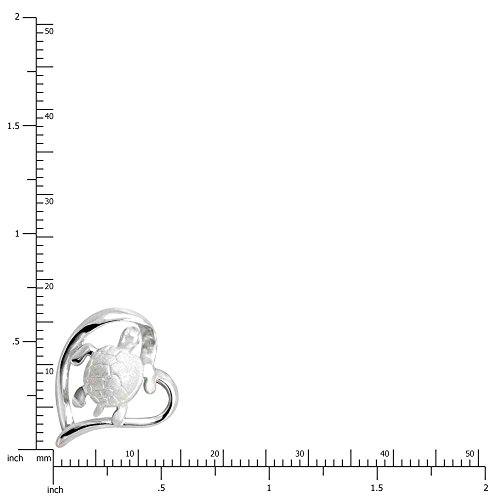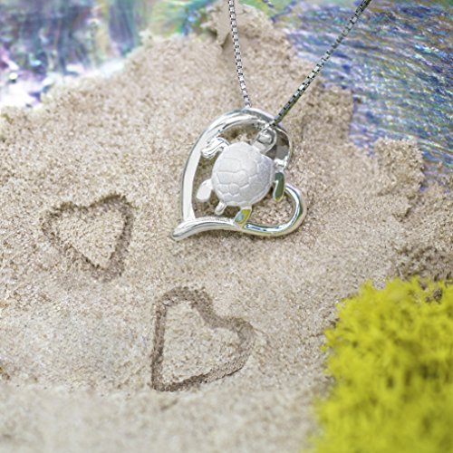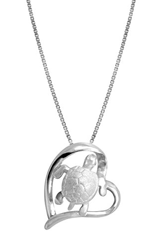 Sterling silver pendant of a turtle and heart. Turtle shell has a smooth sandblast finish. Comes with a 16"-18" adjustable box chain. Gift box included. From Honolulu Jewelry Company, Honolulu, Hawaii.